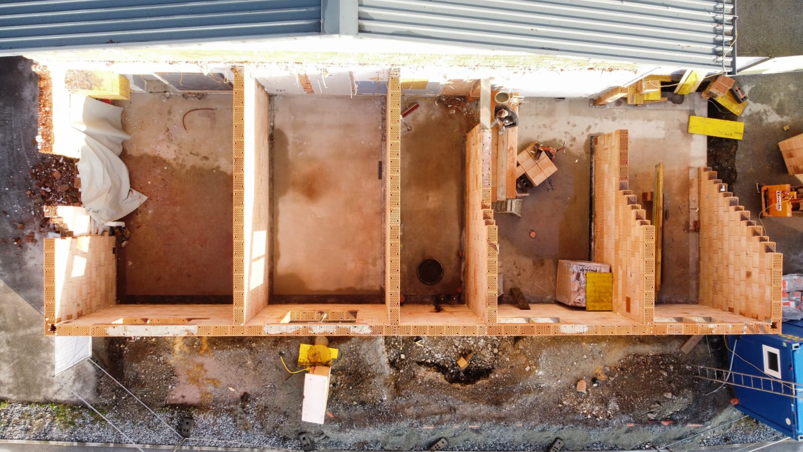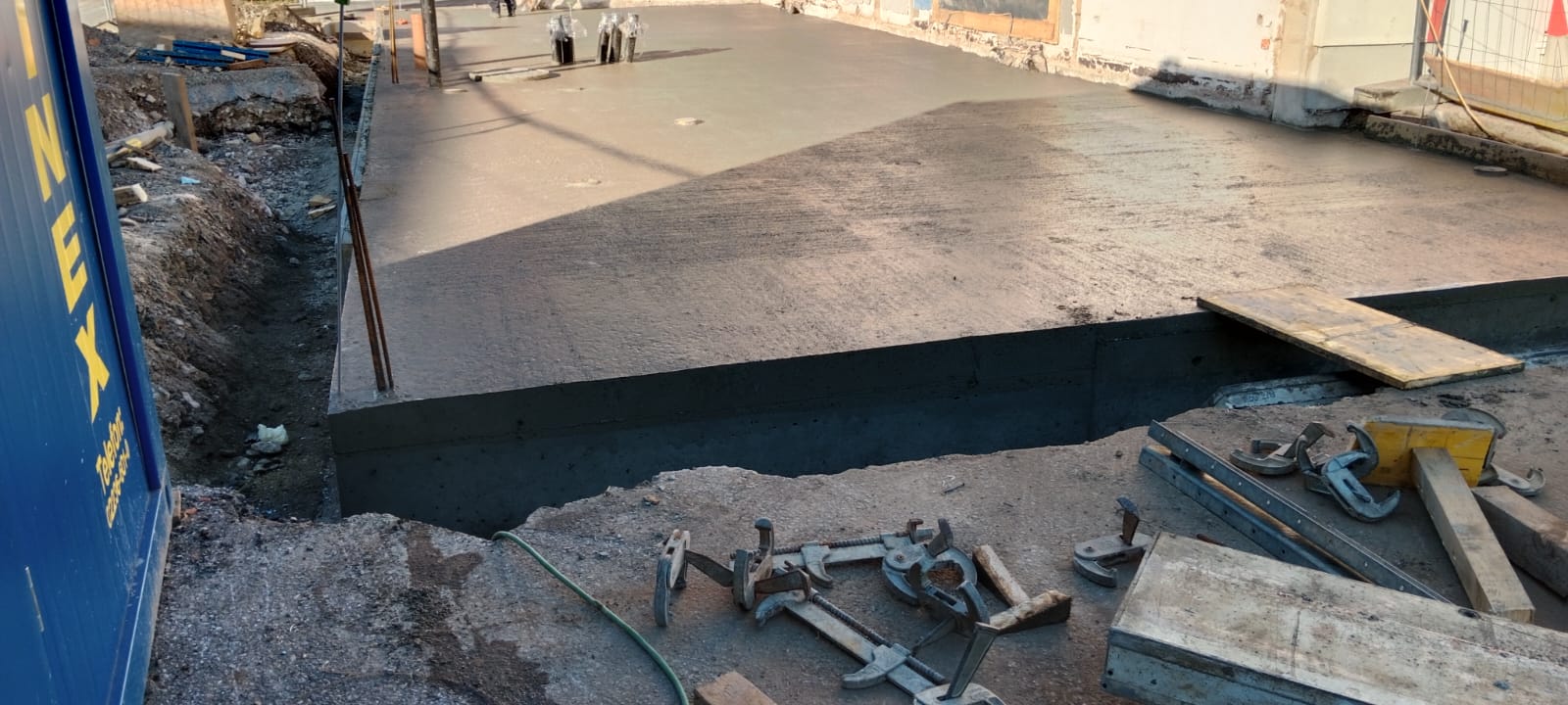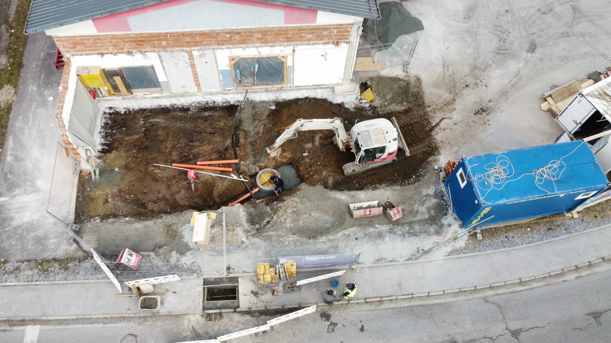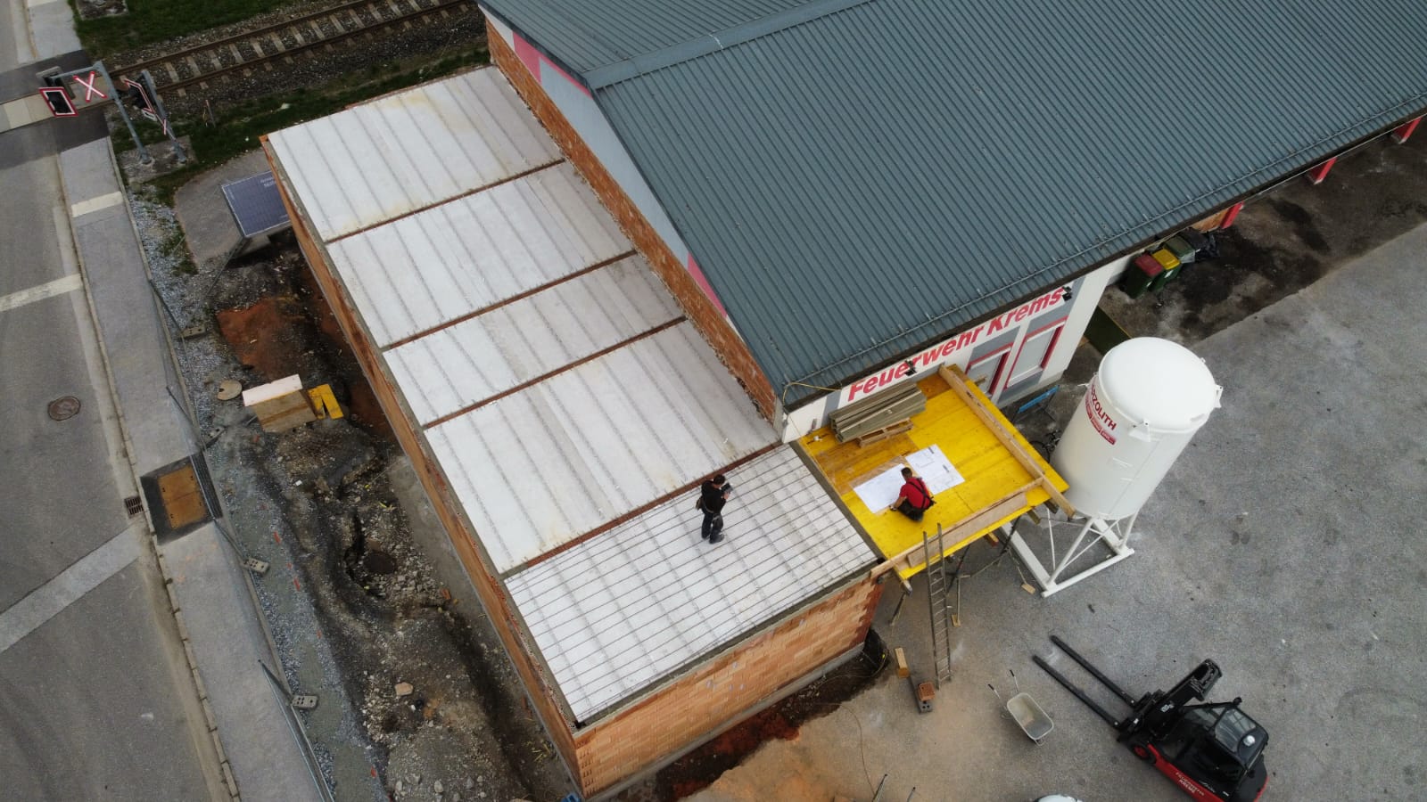 Als zweiter großer Bauabschnitt wurde auf der anderen Seite des Rüsthauses der bestehende Jugendraum, sowie die Toiletten abgetragen. Gleich darauf wurde mit den Arbeiten für die neue, größere Bodenplatte begonnen. Die Mauerarbeiten für die neuen sanitären Einrichtungen, inkl. Behinderten WC, den Technikraum und die Küche sind auch bereits abgeschlossen. Aktuell wird die Betondecke des neuen Zubaus gegossen.