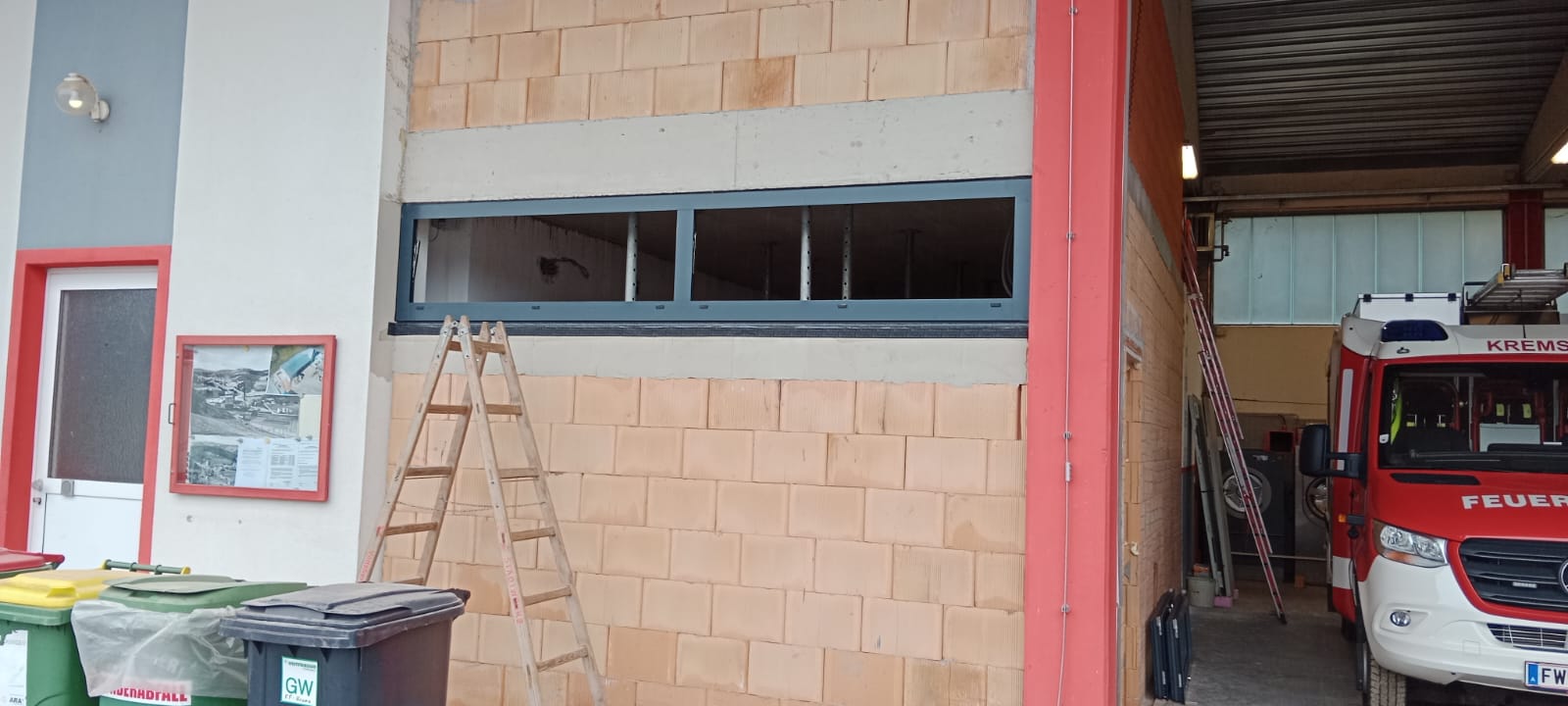 Zunächst wurde im neuen Zubau weiter das Dach fertig gestellt und den Innenausbau gestartet. Es konnten bereits die Wände verputzt und die ersten Fenster gesetzt werden. Aktuell wird die Elektroinstallation voran getrieben. Außerdem wurden die neu geplante Frauenumkleide von der alten Fahrzeughalle abgetrennt.