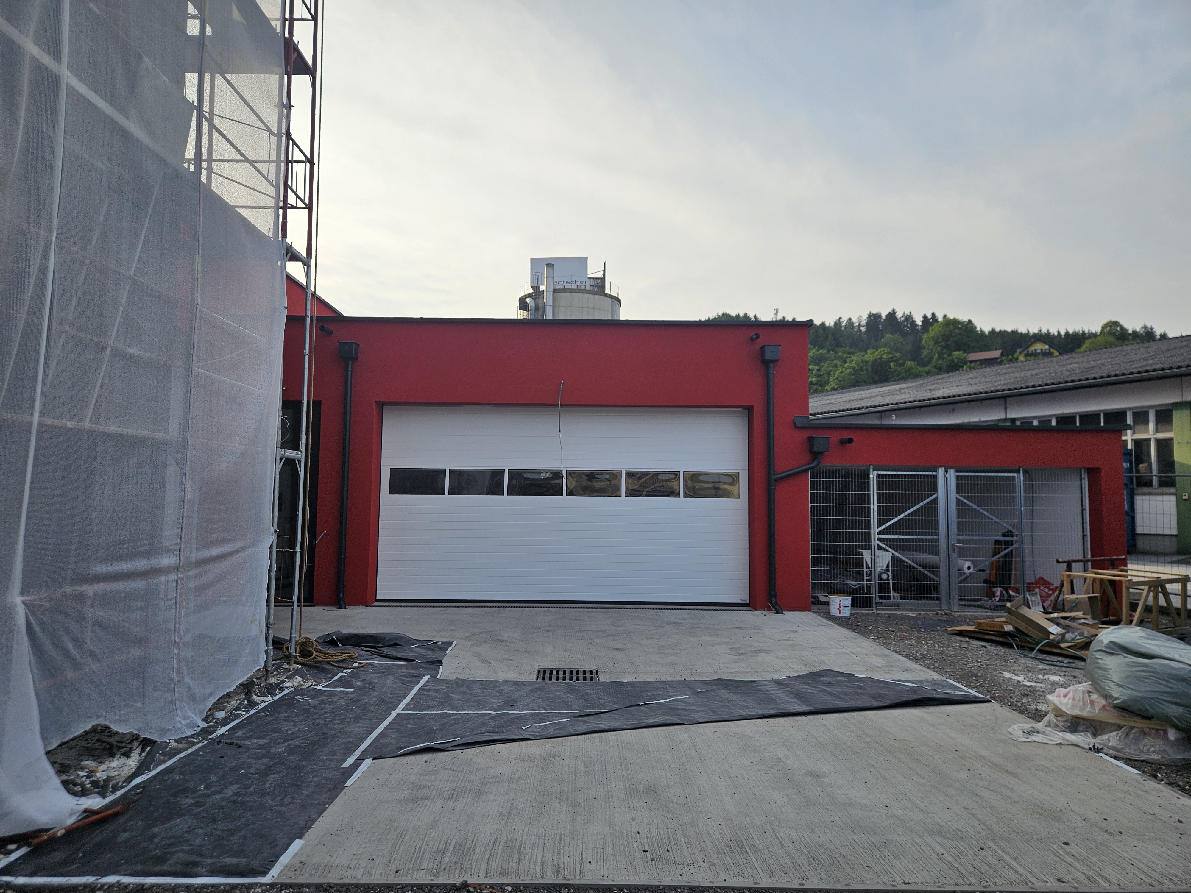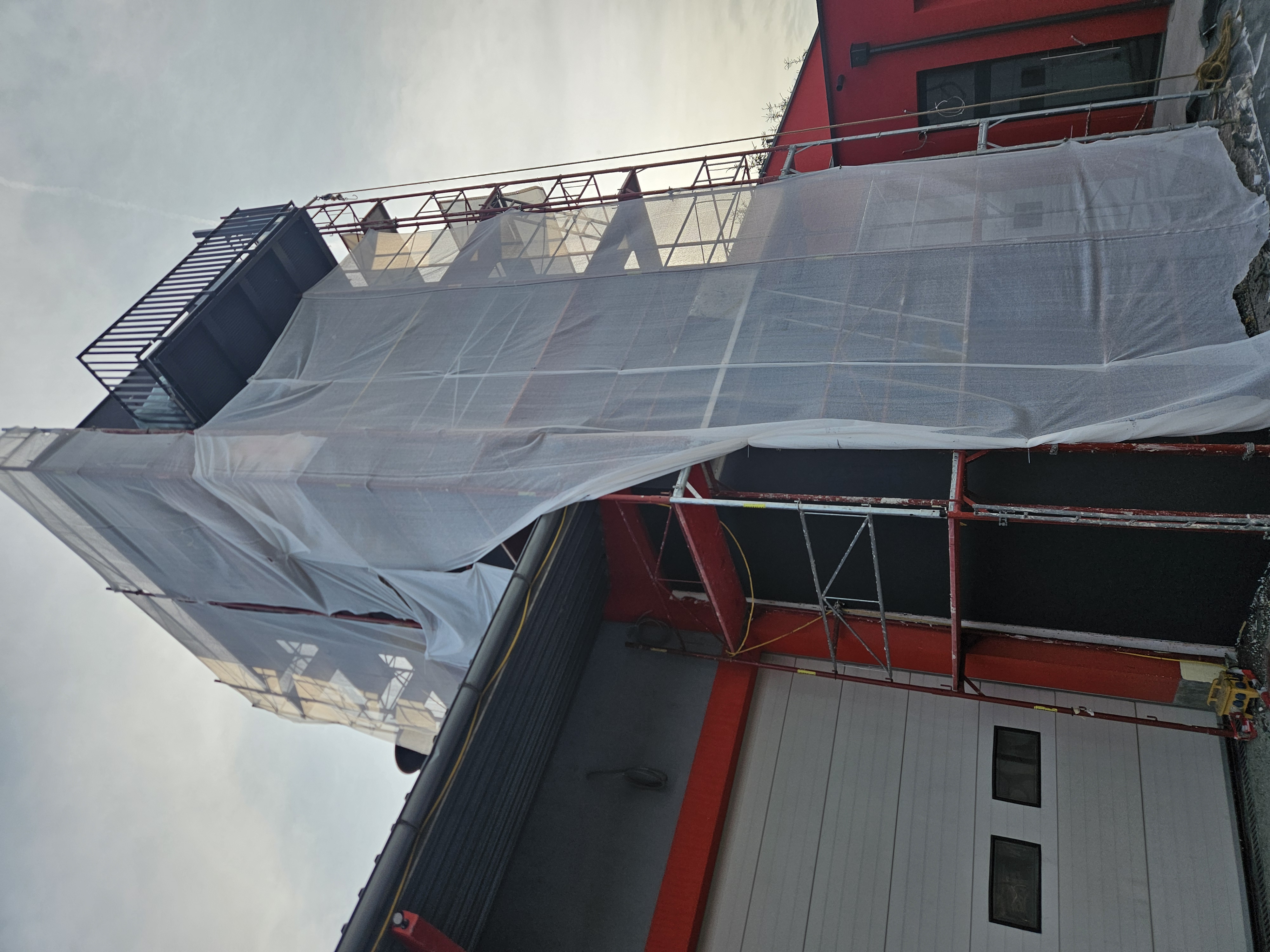 Im Schlauchturm wurde innen die Metalltreppe angebracht. Außen wurde ein Gerüst aufgebaut und sowohl Dämmung sowie Außenfassade vorangetrieben. Auch der Zubau mit unserem neuen Stellplatz wurde außen bereits verputzt und rot gestrichen.